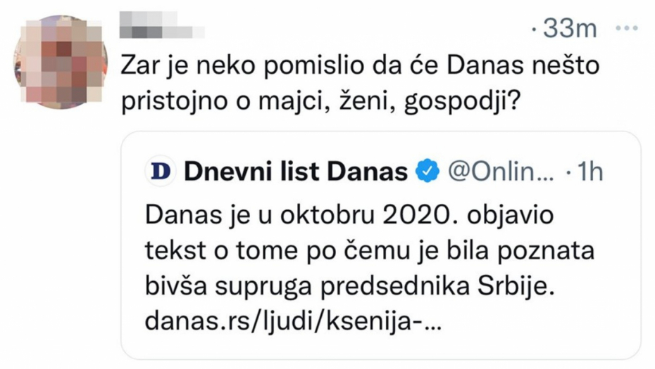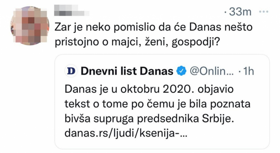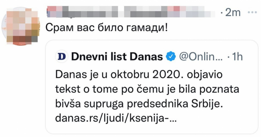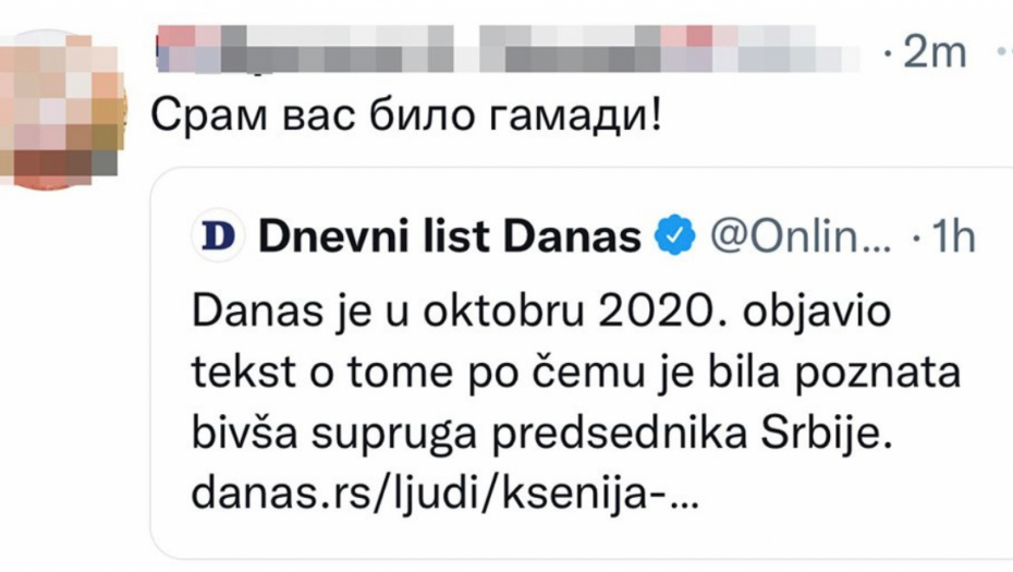 Portal “Danas” koji je pod uređivačkom kontrolom lidera Stranke slobode i pravde Dragana Đilasa, akonto vesti o iznenadnoj smrti novinarke i bivše supruge predsednika Srbije Aleksandra Vučića, Ksenije Vučić, objavio je sraman tvit da je njihov portal u oktobru 2020. objavio tekst o tome po čemu je Ksenija bila poznata.