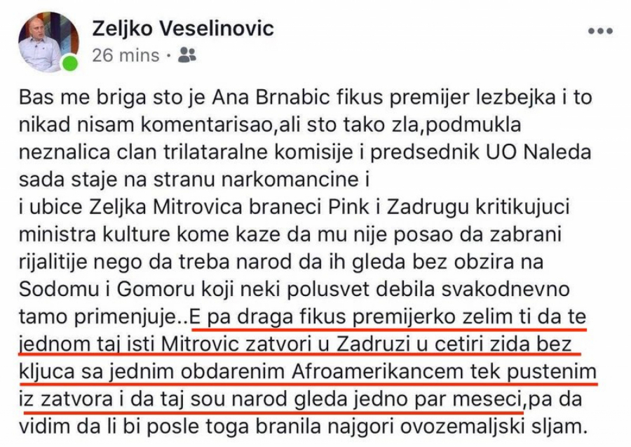 Veselinović je zaprepastio javnost kada je pre nekoliko godina napisao da Anu Brnabić treba zatvoriti u rijaliti sa "obdarenim Afroamerikancima".