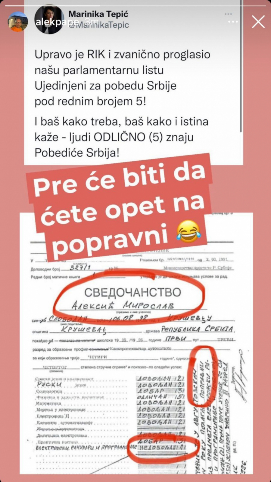 – Upravo je RIK i zvanično proglasio našu parlamentarnu listu Ujedinjeni za pobedu Srbije pod rednim brojem 5! I baš kako treba, baš kako i istina kaže – ljudi ODLIČNO (5) znaju Pobediće Srbija! – napisala je Marinika na Tviteru na šta joj je Papić odgovorio da će pre ići na popravni.