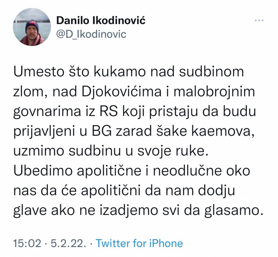- Umesto što kukamo nad sudbinom zlom, nad Đokovićima i malobrojnim go*narima iz RS koji pristaju da budu prijavljeni u BG zarad šake kaemova, uzmimo sudbinu u svoje ruke. Ubedimo apolitične i neodlučne oko nas da će apolitični da nam dođu glave ako ne izađemo svi da glasamo – napisao je tada Ikodinović na Tviteru.