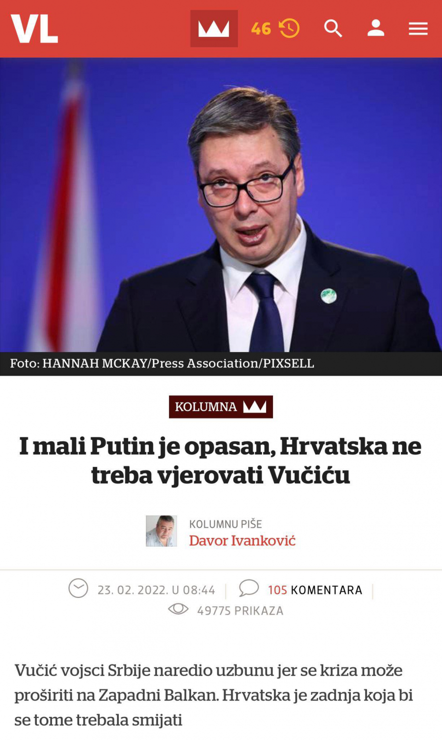 Večernji list je u naslovu teksta predsednika Srbije Vučića nazvao "malim Putinom".