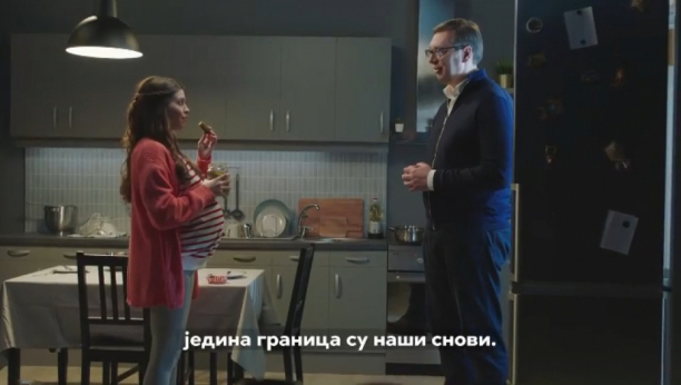 Na početku, trudnica i njen suprug na televiziji vide Vučića. „Joj, evo ga opet ovaj“, kaže suprug. „Stvarno. Samo što još iz frižidera ne iskoči“, dodaje žena. Ona potom otvara vrata frižidera iz kojeg izlazi Vučić. „Oprostite, ali važno mi je da doprem do svakog građanina Srbije. Puno je toga ostalo da se napravi, potrebno nam je još puteva, pruga, fabrika. Ako se ne varam, dobili ste i subvenciju za rešavanje stambenog pitanja. E, kad svi u Srbiji budu imali mogućnosti koje danas imate vi, nećete me toliko viđati. Trudimo se da to bude što pre. Do tada, upamtite, ako ostanemo ujedinjeni s tim ciljevima pred sobom, jedina granica su naši snovi“, govori Vučić, i vraća se u frižider. Na kraju suprug pita trudnicu da li je stavila pitu u rernu, na šta ona odgovara: „Hvala ti, ali nemoj, molim te, iz rerne“, aludirajući da bi Vučić mogao i odatle da iskoči.
