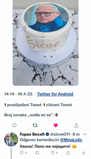 Pratilac i fan zamenika gradonačelnika Beograda Gorana Vesića sa društvenih mreža, poželeo je rođendansku tortu sa Vesićevim likom i tu objavu sa slikom postavio na Tik-Toku.