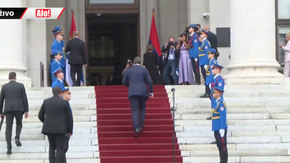 10:50 - Aleksandar Vučić se zatim uputio u zgradu Narodne skupštine, gde ga je na vratima dočekao Ivica Dačić.