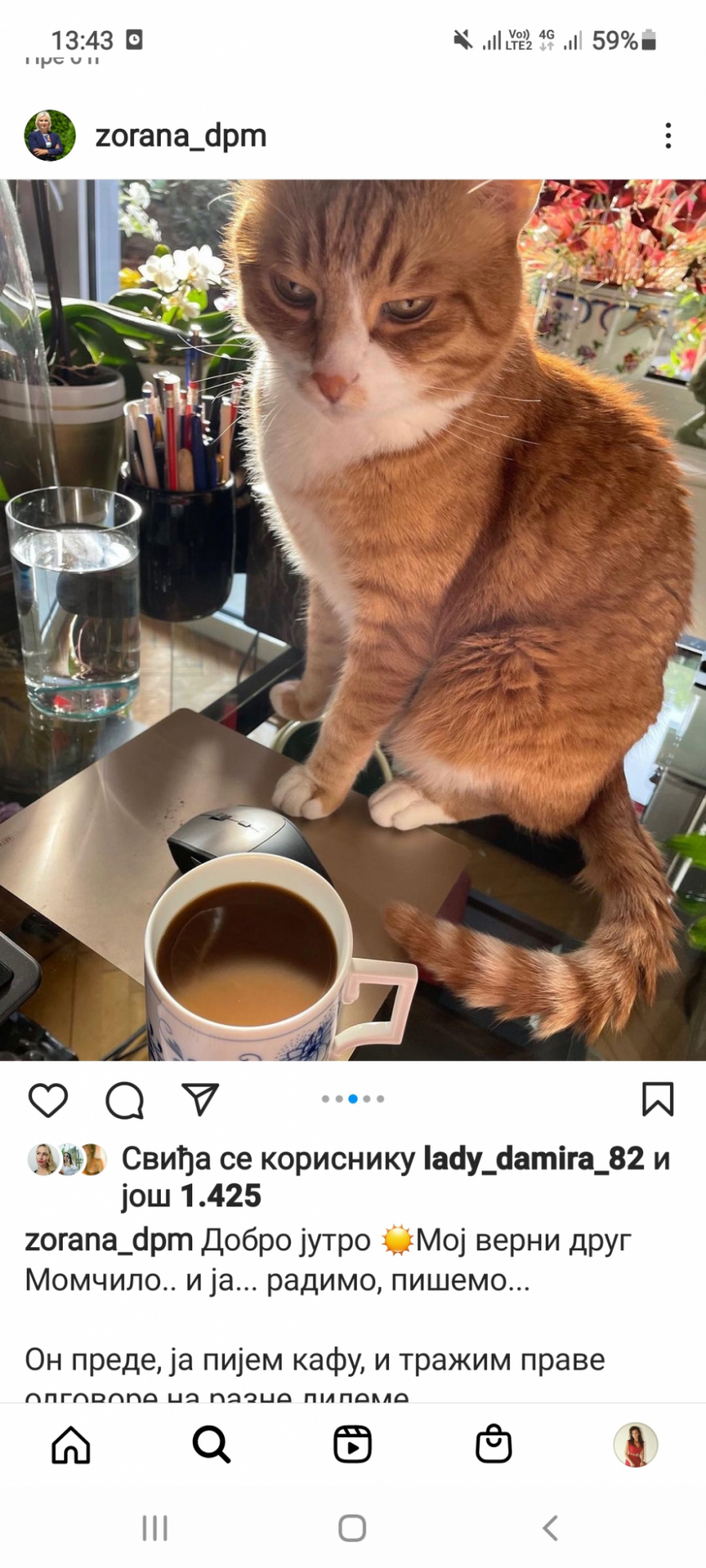 „ Dobro jutro. Moj verni drug Momčilo.. i ja... radimo, pišemo... On prede, ja pijem kafu, i tražim prave odgovore na razne dileme“, napisala je ministarka.