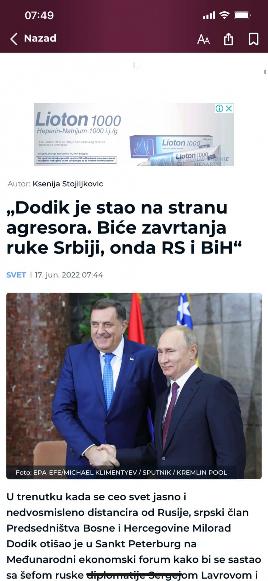 Poslednji primer je napad Nove koja najavljuje kažnjavanje Srbije zbog posete Milorada Dodika Rusiji. Milorad Dodik nije političar i funkcioner u Srbiji, ali to njima ne smeta da sami stvaraju svoju verziju događaja i guraju zadatu priču.