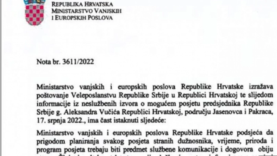 POGLEDAJTE SRAMNU NOTU MSP HRVATSKE Evo šta stoji u zvaničnom dokumentu kojim se Vučiću zabranjuje poseta Jasenovcu!