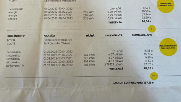 Ali, kako se zaista pravilno obračunava potrošnja 378kWh u Finskoj, po važećim tarifama pomentue kompanije HELEN sa uračunatim PDV?