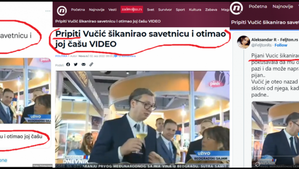 Tako Nova S, kipteći od mržnje zbog uspeha Sajma vina, i zbog Samita Otvoreni Balkan, objavljuje lažnu vest:„Pijani Vučić šikanirao savetnicu i otimao joj čašu“, da bi onda promenili naslov i objavili drugu laž: „Pripiti Vučić šikanirao savetnicu i otimao joj čašu”. Uz lažnu vest su objavili postove nekih maloumnika sa Tvitera. Objavili su i video snimak, koji potpuno demantuje naslove Nova S. Na snimku se vide predsednik Vučić i njegova savetnica Suzana Vasiljević, kako degustiraju vino. Potom predsednik odlaže čašu i svi odlaze dalje u obilazak Sajma Vina. Na snimku se jasno vidi da niko nije pijan, niti pripit, i da nema nikakvog šikaniranja. Ovo je uobičajeni trik tajkunskih antisrpskih medija – oni objave šokantan i uvredljiv naslov, koji je u suprotnosti sa sadržajem i ili video prilogom. Važno im je da su oni lansirali lažnu vest o pijanom Vučiću koji šikanira saradnicu. Računica je sledeća. Računaju na površnost, da će većina poverovati lažnom naslovu, a ne sadržaju teksta, ili video prilogu, iz kojih se jasno vidi da je naslov čista laž.