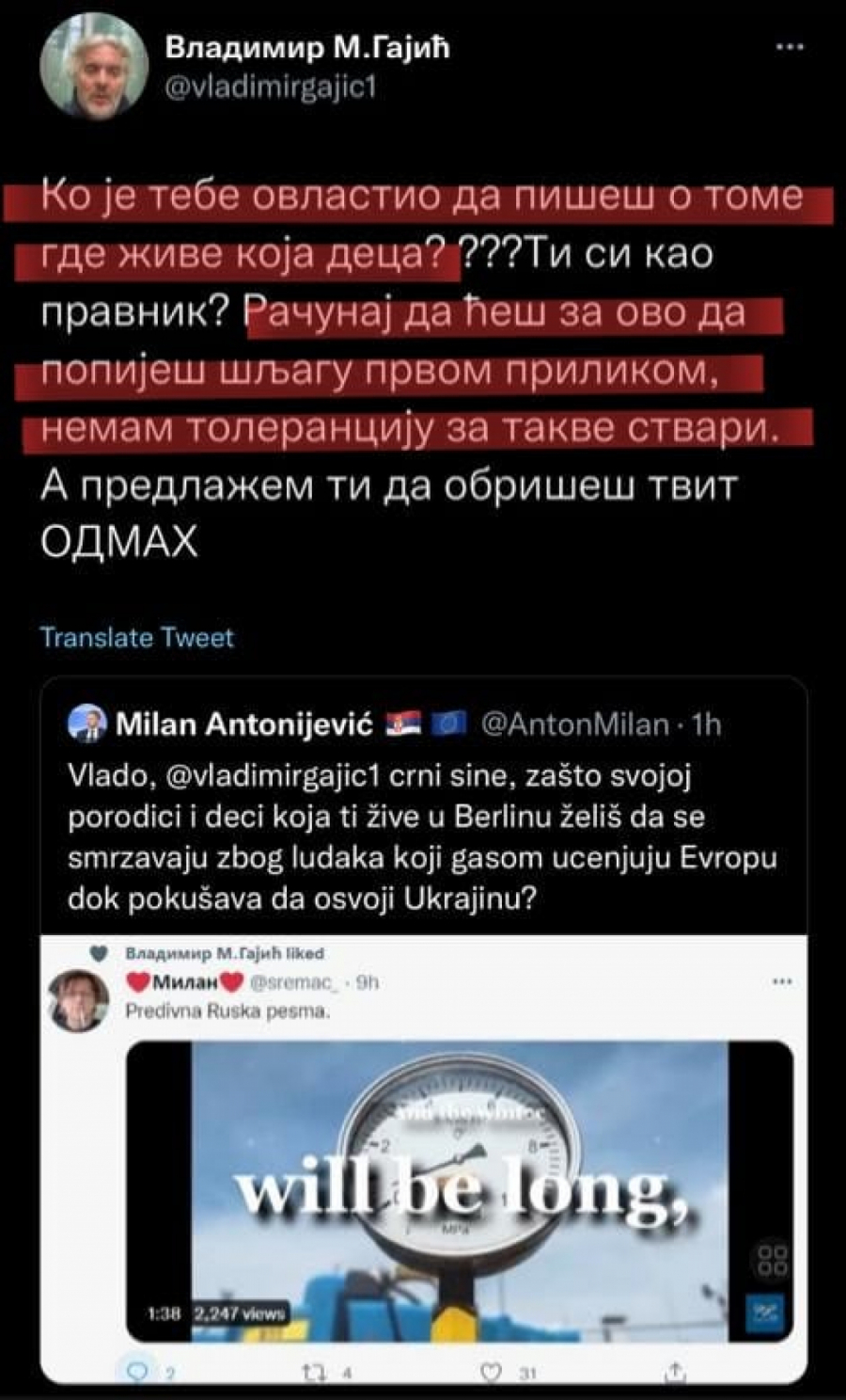 Vladimir Gajić je jedna teška sirovina i bitanga - naravno da krije da je porodicu već obezbedio u Berlinu pa onda nije ni čudo da radi na rušenju Srbije, šta ga briga za narod.