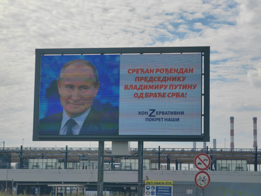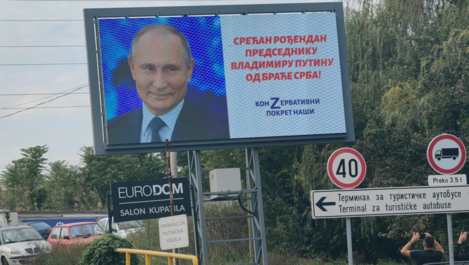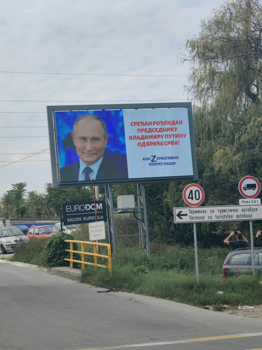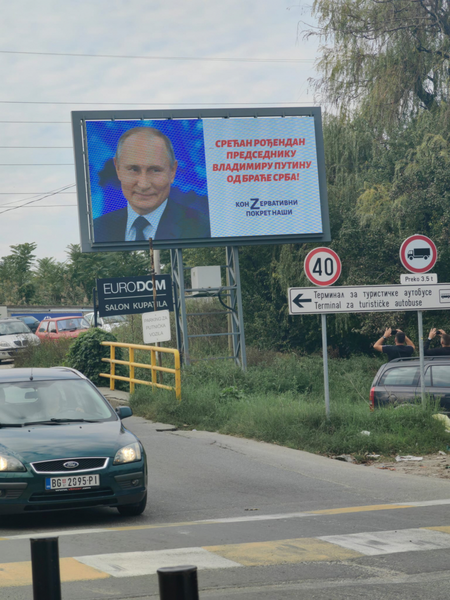 Na bilbordima se nalazi lik predsednika Vladimira Putina uz natpis "Srećan rođendan predsedniku Vladimiru Putinu od braće Srba! " kao i potpis "KonZervativni pokret NAŠI".