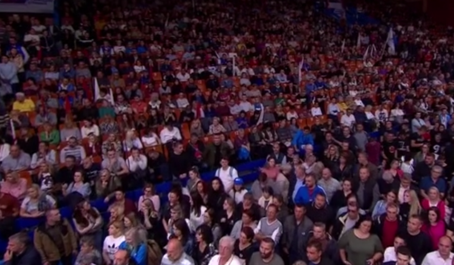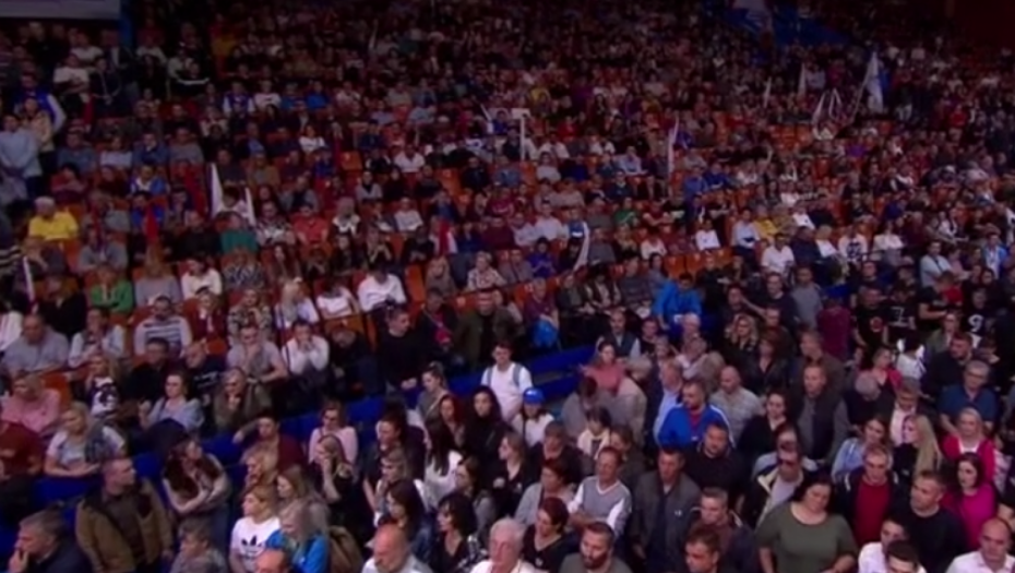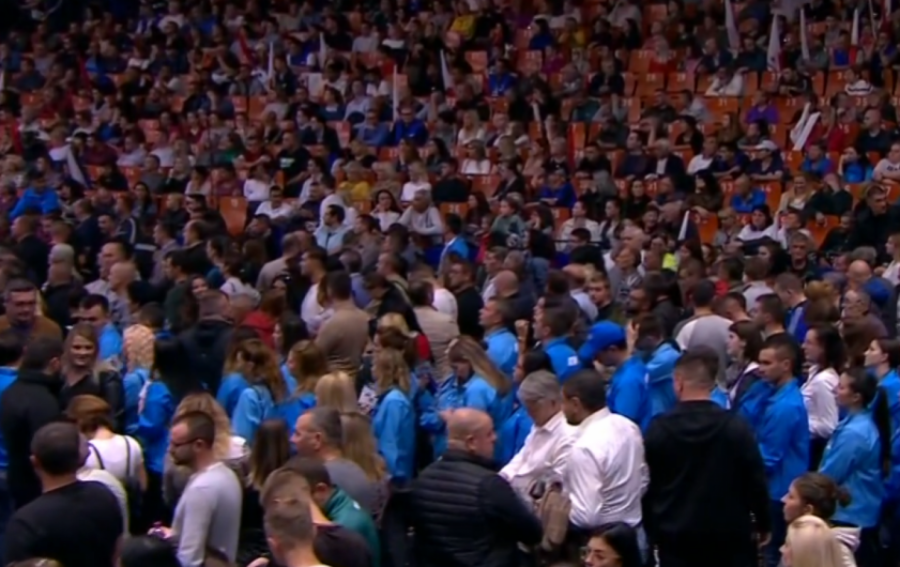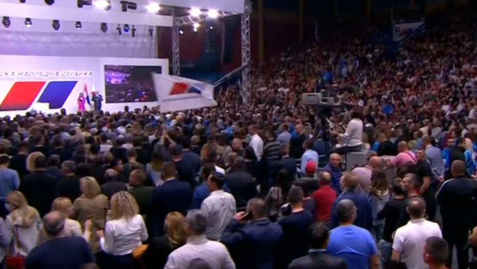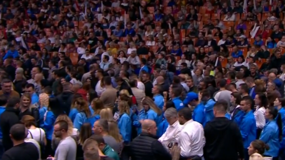 Predsednik Vučić pri ulasku u halu pozdravljen burnim aplauzom uz skandiranjem "Aco Srbine". U prvim redovima kraj Vučića su njegovi najbliži saradnici, premijerka i članovi Vlade Srbije.