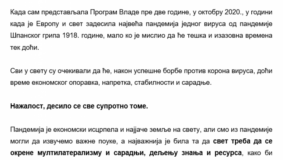 - Kada sam predstavljala progrem Vlade pre dve godine, u godini pandemije virusa korona, malo ko je verovao da će teška i izazovna vremena tek doći - navodi Brnabić.