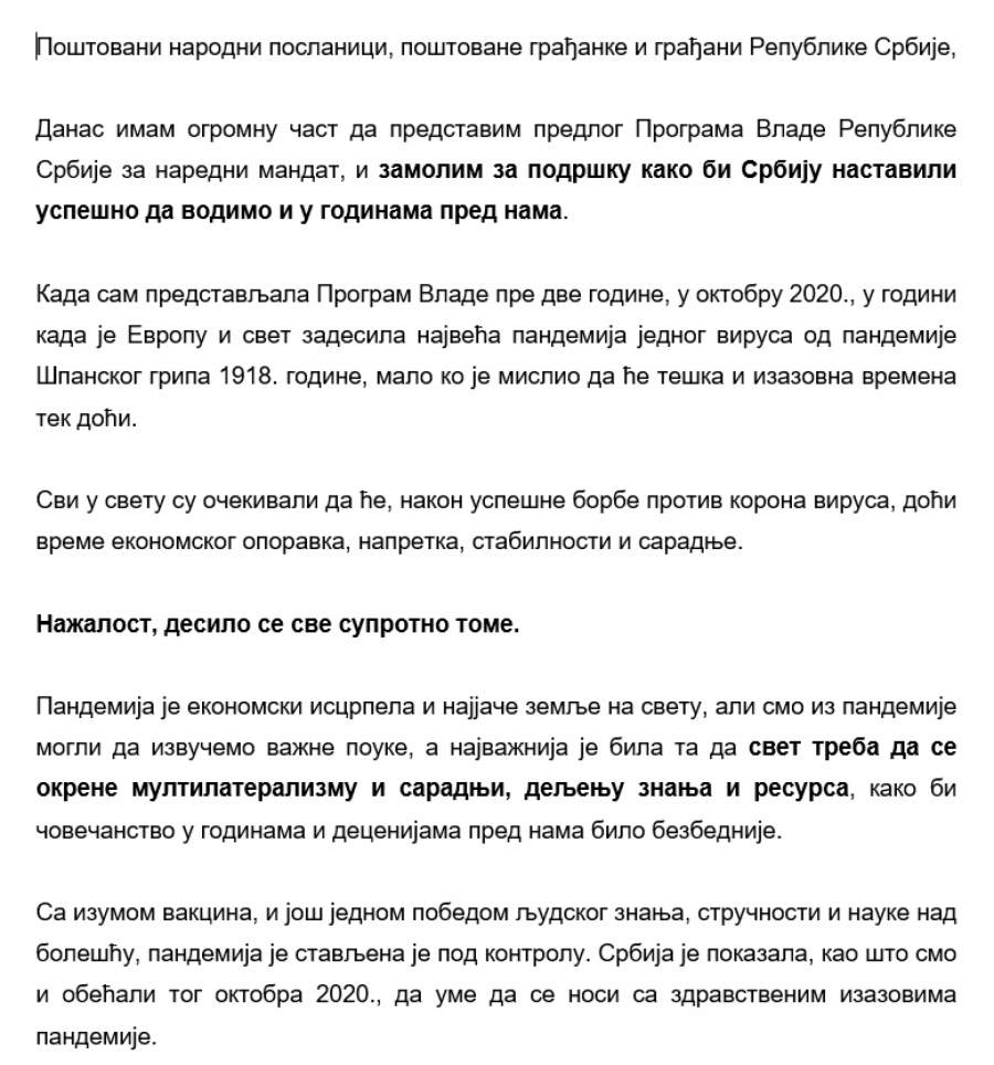 Kao što sam naglasila na početku, svako na svetu je mislio da nakon pandemije korona virusa dolaze bolji dani – dani stabilnosti, mira i prosperiteta. Umesto toga, desilo se nešto što je bilo teško zamislivo nakon Drugog svetskog rata – rat na evropskom kontinentu. Od 24. februara ove godine, kada je započeo rat u Ukrajini, sve u svetu, a posebno na evropskom tlu, se promenilo. Gotovo jedina spoljnopolitička tema je Ukrajina i odnos prema Ruskoj Federaciji. Dve isključive ekonomske teme postale su: energetika i inflacija. Svet polako, od tog 24. februara klizi u Treći svetski rat, sa sve češćim i sve ozbiljnijim zveckanjem nuklearnim naoružanjem i sve manjim šansama za mir koji bi se sklopio u kratkom rok. U političkom smislu, sve više deluje da su emocije nadvladale razum, a da će najveća jagma u budućnosti biti jagma za energentima i hranom. U takvom svetu Srbija treba da se pozicionira, zadrži svoju stabilnost i nastavi svoj rast i razvoj i, to je, najjednostavnije rečeno, osnovni zadatak buduće Vlade. Koliko će to biti teško i koliko ćemo naporno svi zajedno morati da radimo, u timu sa predsednikom Republike Srbije Aleksandrom Vučićem, i uz razumevanje i podršku Narodne skupštine Republike Srbije, a na korist svih naših građana i celog našeg naroda, možda najbolje govore i reči jednog od najprominentnijih evropskih lidera, predsednika Francuske Emanuela Makrona, koji je krajem avgusta ove godine rekao da „trenutak u kojem živimo izgleda kao da je sazdan od niza kriza, od kojih je svaka ozbiljnija od prethodne“, i upozorio da dolazi kraj „obilja i bezbrižnosti“. Nikoga, zato, neće čuditi što će nam apsolutni prioritet u mandatu ove Vlade biti energetika, odnosno, kako je to jednom prilikom naglasio i predsednik Republike Srbije, Aleksandar Vučić – nova energetska politika Srbije - rekla je Brnabić.