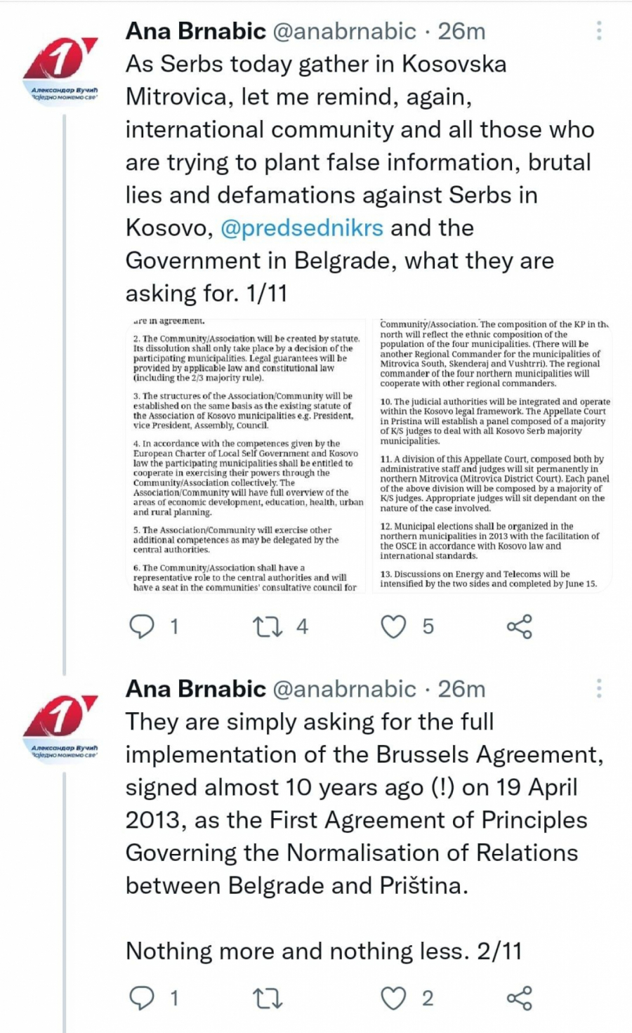 - U trenutku kada se Srbi danas okupljaju u Kosovskoj Mitrovici, da podsetim, još jednom, sve u međunarodnoj zajednici, ali i sve one koji pokušavaju da podmetnu lažne informacije, brutalne laži i klevete Srbima na Kosovu i Metohiji, predsedniku Vučiću i Vladi u Beogradu, šta oni traže. Oni jednostavno traže punu primenu Briselskog sporazuma, potpisanog pre skoro 10 godina (!), 19. aprila 2013. godine, kao Prvog principa koji reguliše normalizaciju odnosa Beograda i Prištine. Ništa više i ništa manje.
