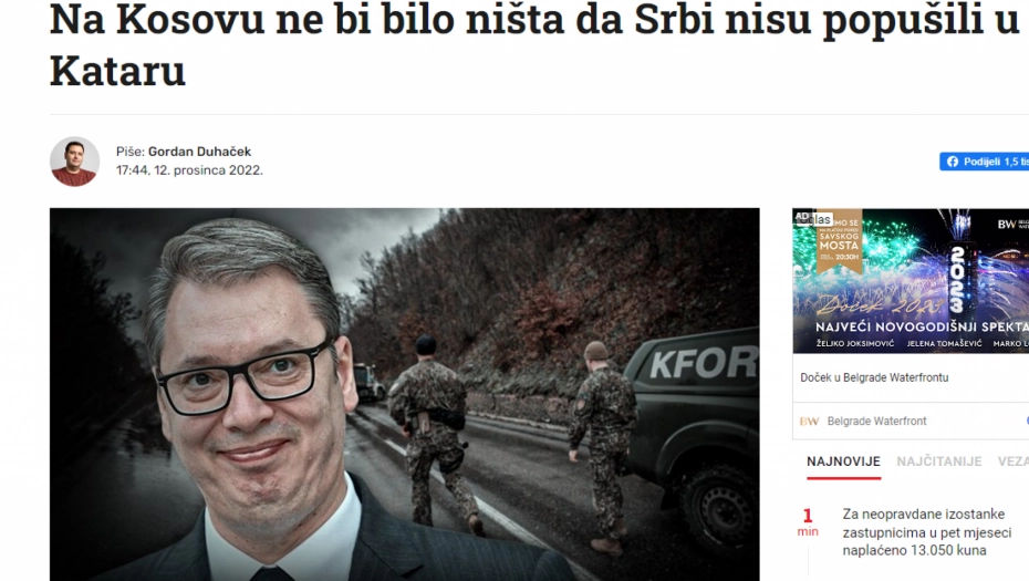 "Na Kosovu ne bi bilo ništa da Srbi nisu popušili u Kataru," glasi tekst na Index.hr.