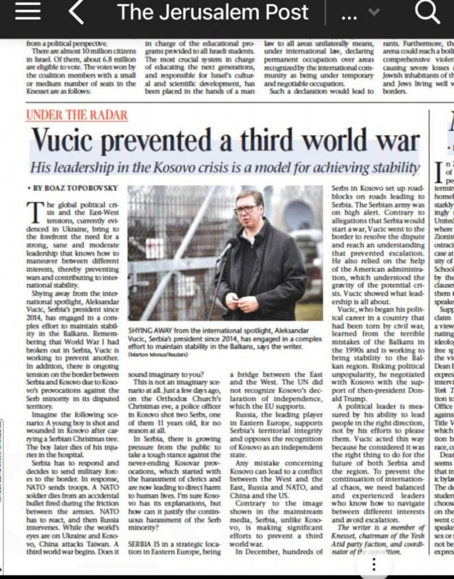 Glavna vest u današnjem Jerusalim postu je pod naslovom “Kako je predsednik Srbije Aleksandar Vučić zaustavio Treći svetski rat”.