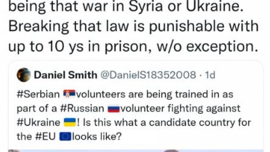 On je reagova na objavu koja se širi društvenim mrežama o srpskim dobrovoljcima koji ratuju za Rusiju, a u kojoj se navodi da to ne bi trebalo da radi zemlja sa statusom kandidata za EU.