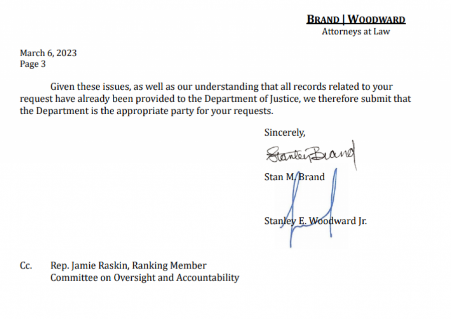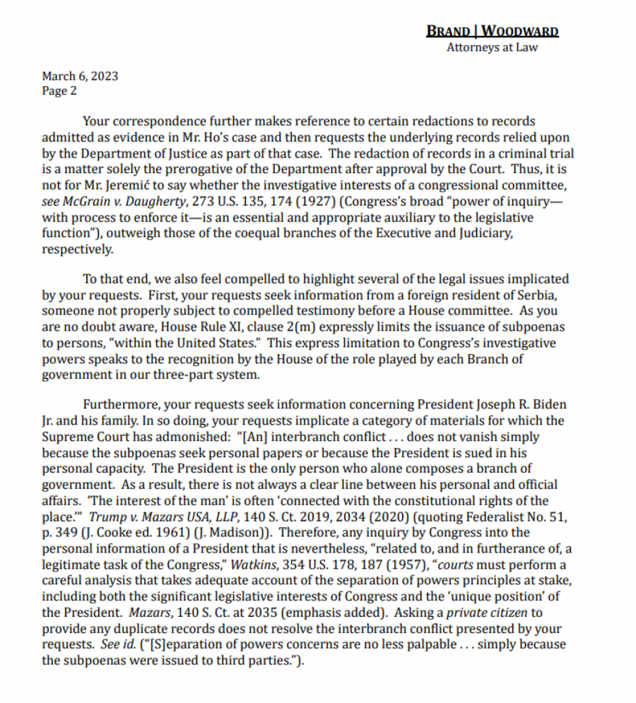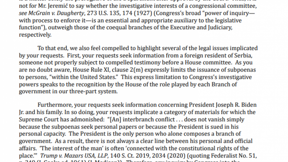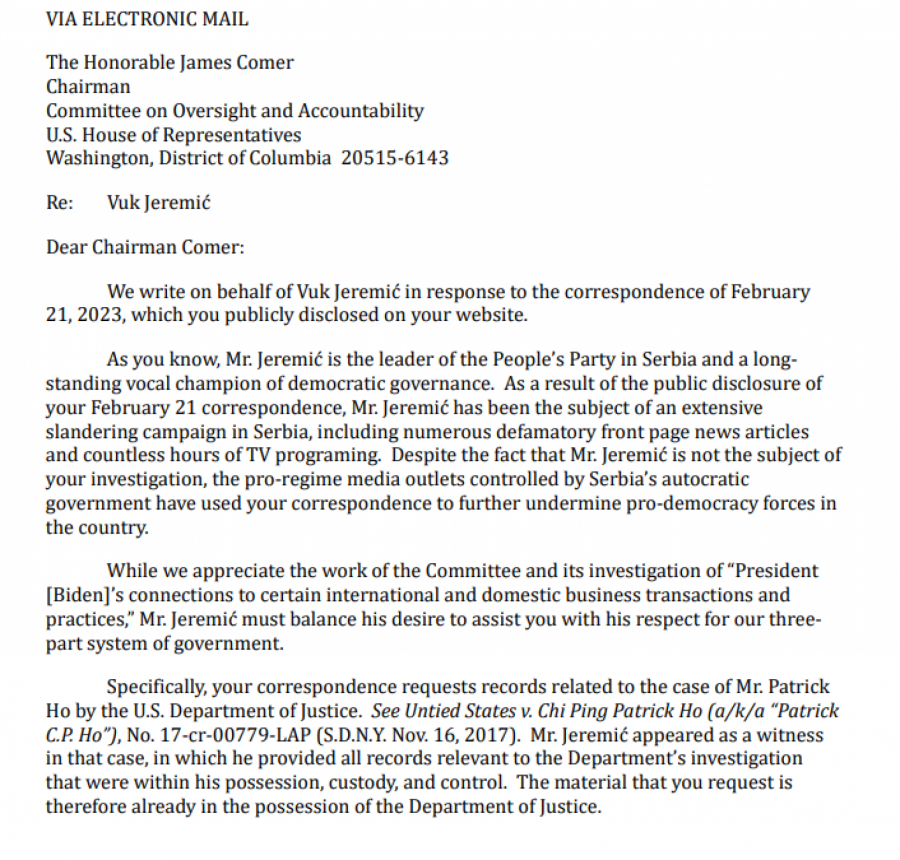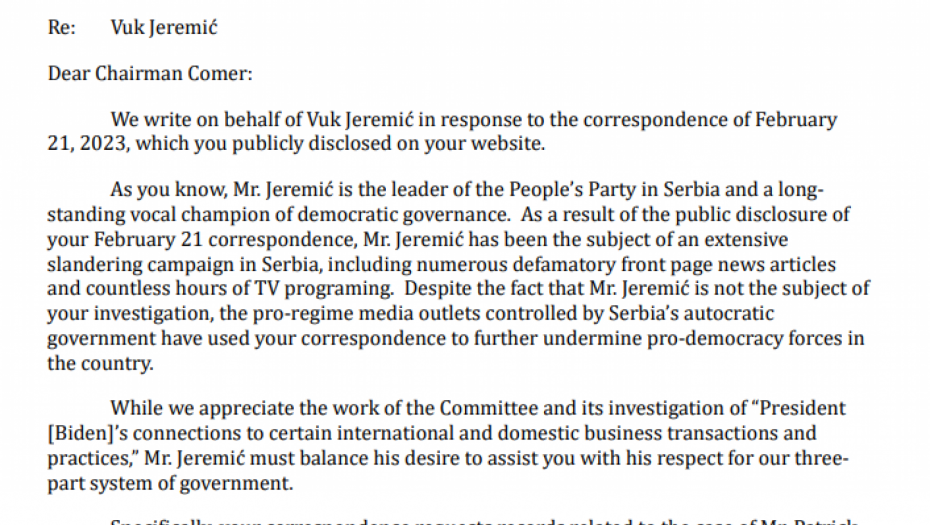 U pismu Jeremiću, Komer je naveo da je revizija svedočenja od strane komisije u federalnom krivičnom gonjenju Sjedinjenih Država protiv Patrika Hoa, navela članove Odbora za nadzor i odgovornost Predstavničkog doma da veruju da Jeremić ima evidenciju i informacije u vezi sa inostranim poslovima porodice Bajden.
