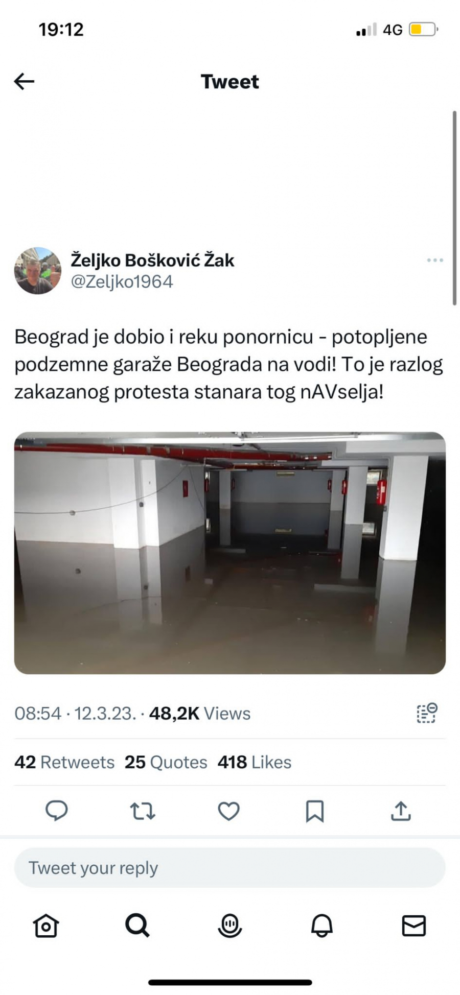 – Beograd je dobio i reku ponornicu – potopljene podzemne garaže Beograda na vodi! To je razlog zakazanog protesta stanara tog naselja! – glasio je tvit Jeremićevog patolaškog lažova, Željka Boškovića.