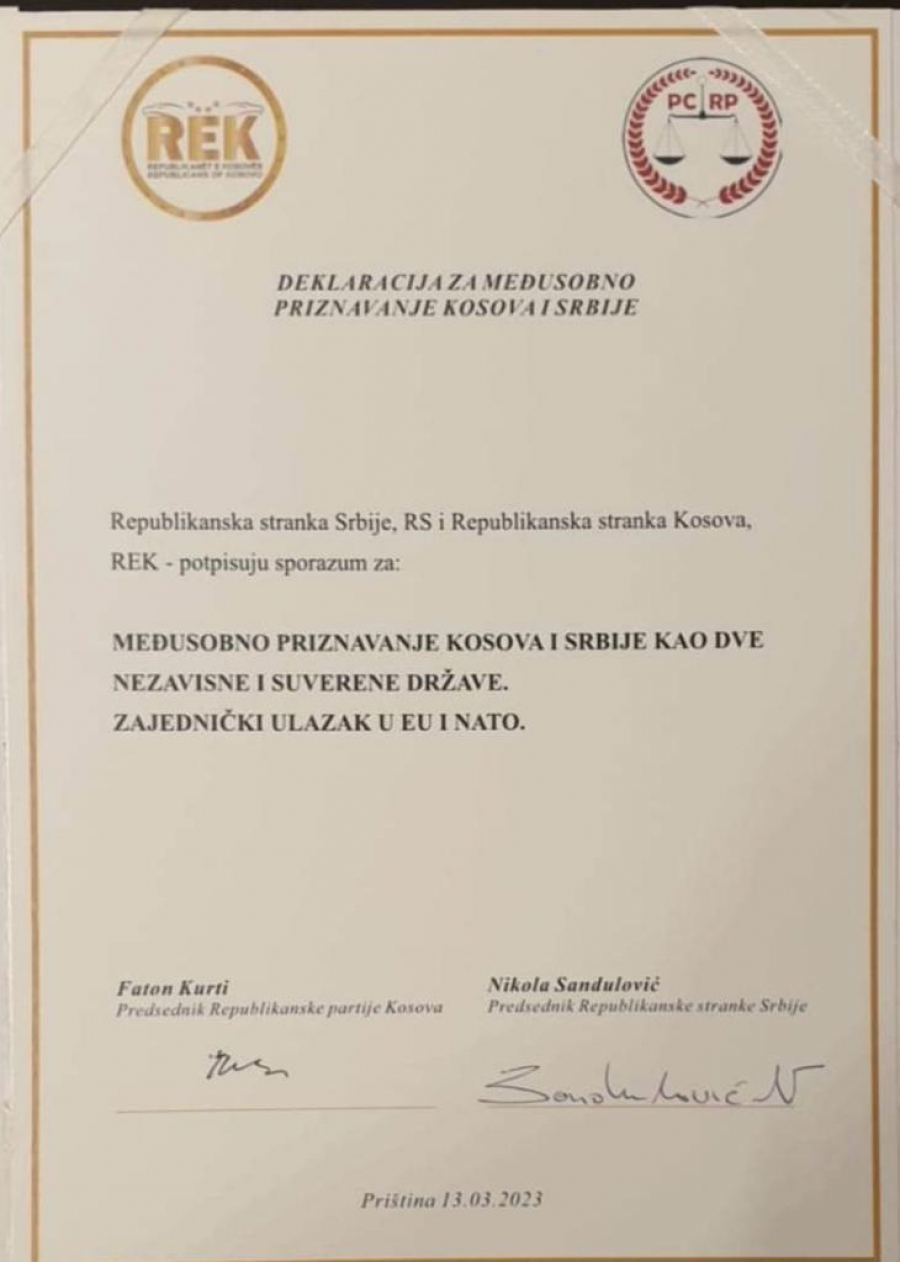 Nikola Sandulović, predsednik “Republikanske stranke Srbije” i Faton Kurti, predsednik “Republikanske stranke Kosova” potpisali su danas u Prištini sporazum odnosno deklaraciju za međusobno priznavanje Srbije i tzv. Kosova.