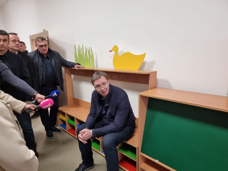 Nakon obraćanja, predsednik Vučić je obišao predškolsku ustanovu "Poletarac" u Rumi, novootvoreni vrtić.