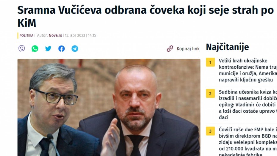"Predsednik Srbije Aleksandar Vučić još jednom je stao u odbranu Milana Radoičića, kontroverznog biznismena sa KiM, kog su SAD i Velika Britanija stavile na crnu listu zbog kriminala i korupcije. Predsednik Srbije je Milana, kako ga je nazvao, opisao kao čoveka koji se bori za svoj narod i kao nekoga koga se plaše i kog vide iza svakog drveta", piše u sramnom tekstu na portalu Nova.