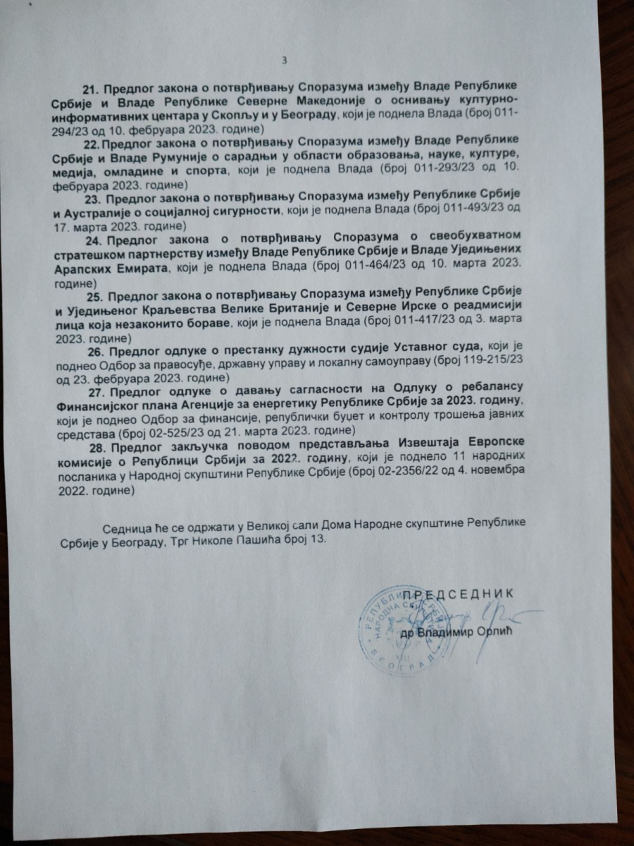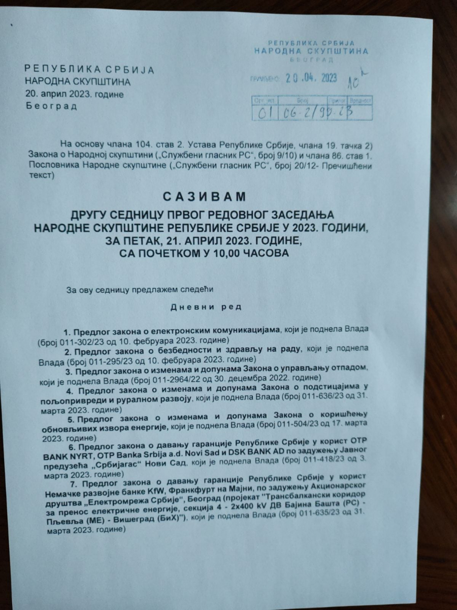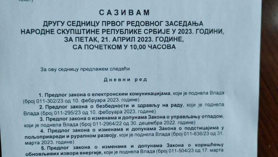 Početak sednice je zakazan za petak 21. april 2023. godine sa početkom u 10,00 časova.
