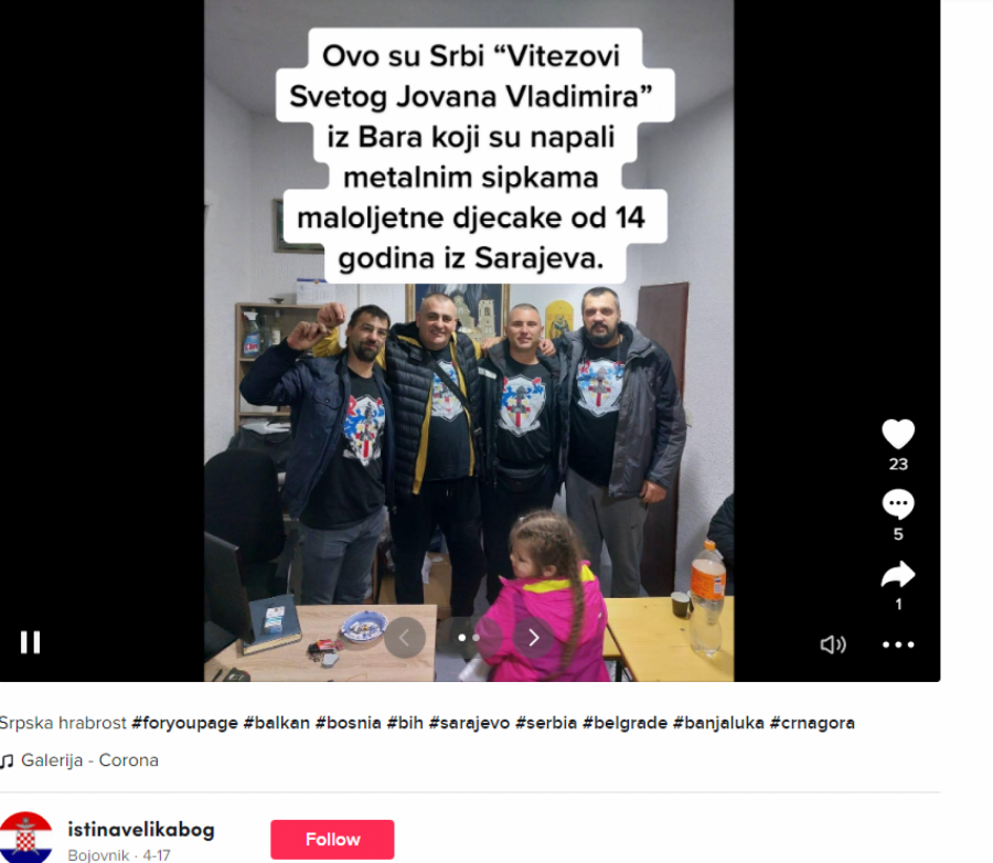 "Ovo su Srbi "Vitezovi svetog Jovana Vladimira" iz Bara koji su napali metalnim šipkama maloletne dečake od 14 godina iz Sarajeva," navodi se u objavi uz fotografiju bratstva.