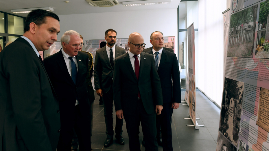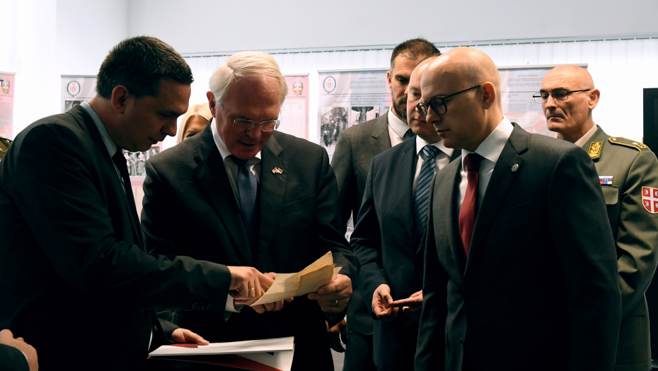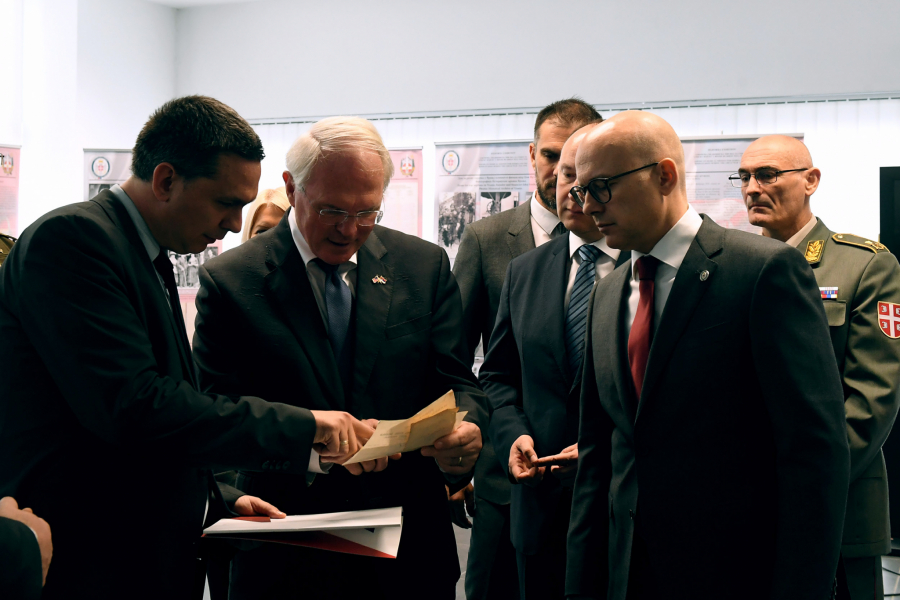 Ministar Vučević i ambasador Hil obišli su danas i izložbu u Istorijskom arhivu – „Vojne kape i šlemovi od sredine 19. veka do danas“, koju su priredili autori Zoran Veljanović i novosadski kolekcionar Dejan Kragić. Izložba, posvećena delu vojničke istorije i tradicije, prikazuje više desetina muzejskih predmeta hronološki složenih prema periodima, državama i rodovima.