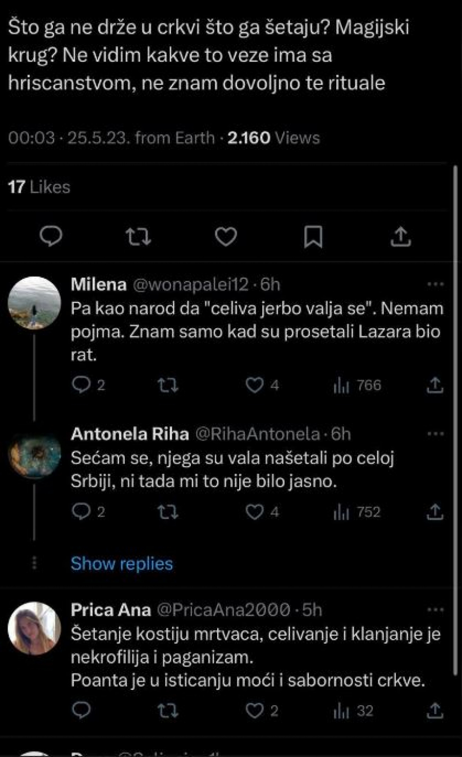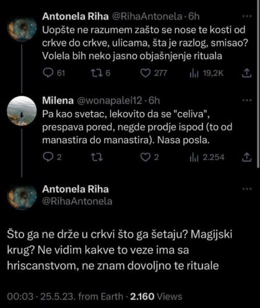 - Uopšte ne razumem zašto nose te kosti od crkve do crkve, ulicama, šta je razlog, smisao? Volela bih neko jasno objašnjenje rituala...