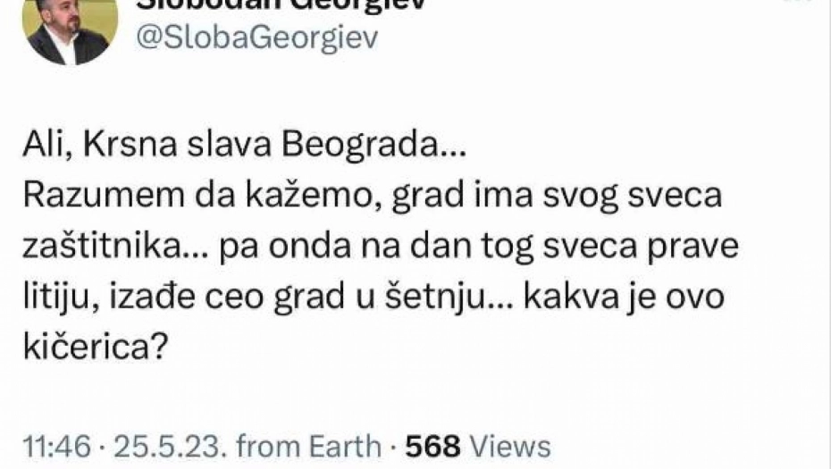 - Ali, Krsna slava Beograda... Razumem da kažemo, grad ima svog sveca zaštitnika... pa onda na dan tog sceva prave litiju, izađe ceo grad u šetnju... kakva je ovo kičerica - napisao je Georgiev.