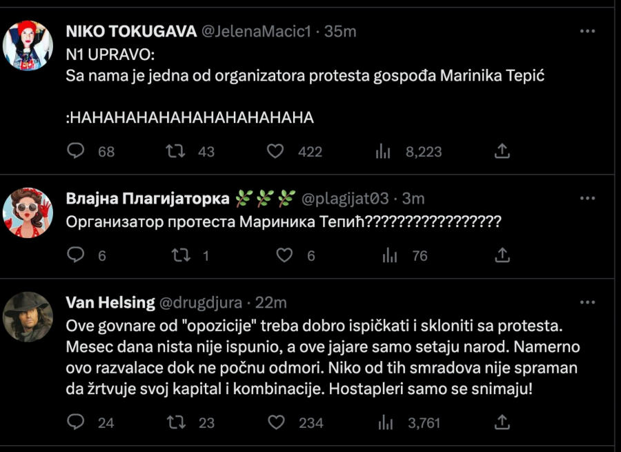 "MARINIKA TEPIĆ JEDAN OD ORGANIZATORA PROTESTA" Najava N1 izazvala dramu na Tviteru, ljudi shvatili da su nasamareni