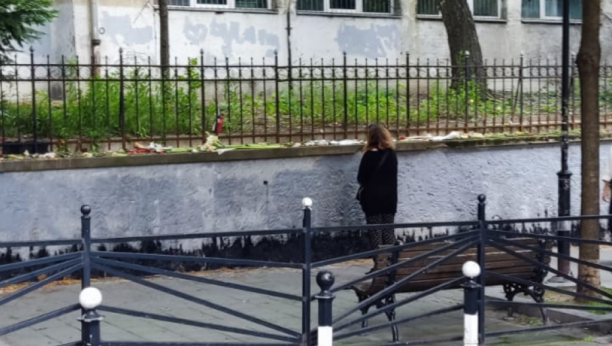 Na zadnjem ulazu u školu stoji samo jedna žena.