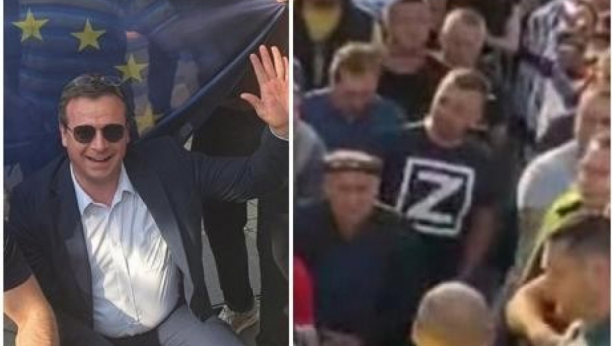 Na zaprepašćenje mnogih zajedno na protestu su se pojavili Čedomir Stojkovic ispred NATO zastave i čovek sa majicom sa slovom Z. Prozapadni, proruski aktivisti, samo ne prosrpski izgleda.