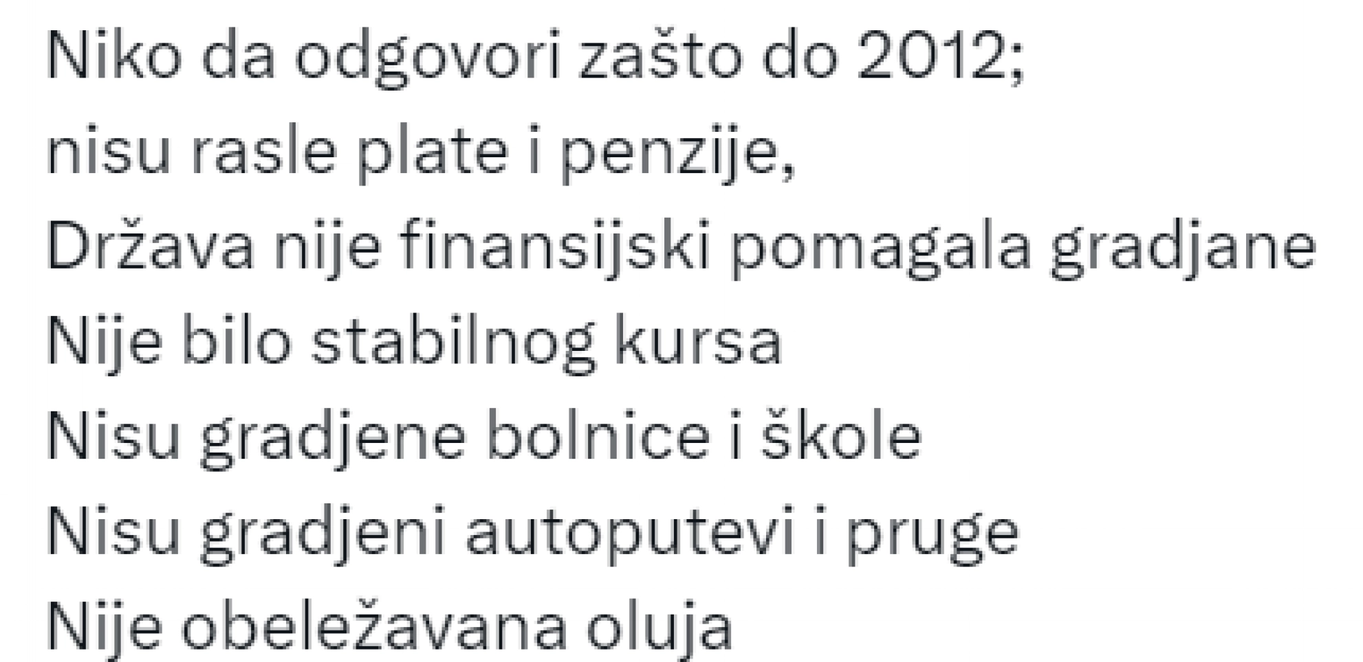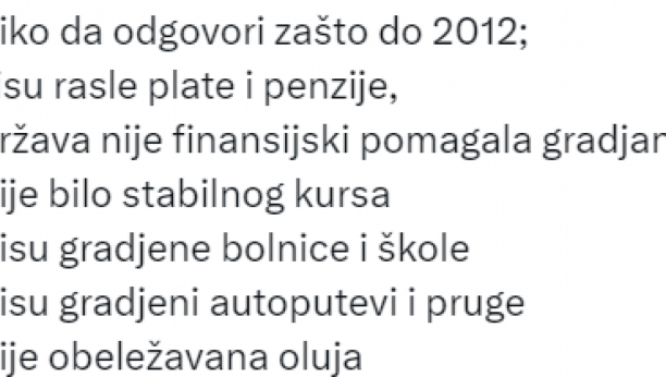 - Niko da odgovori zašto do 2012. nisu rasle plate i penzije, država nije finansijski pomagala građane, nije bilo stabilnog kursa, nisu građene bolnice i škole, nisu građeni autoputevi i pruge, nije obeležavana "Oluja", nisu pominjane Košare, nije pominjan Jasenovac. Zašto?