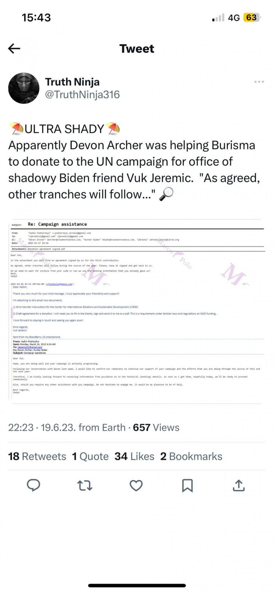 Kontroverzna figura američke politike i biznisa, Devon Arčer, navodno je pomagao kompaniji "Burisma" da donira novac za kampanju u Ujedinjenim nacijama za postavljanje na mesto predsednika Generalne skupštine "prijatelja iz senke" Bajdena Vuka Jeremića, u ovoj organizaciji.