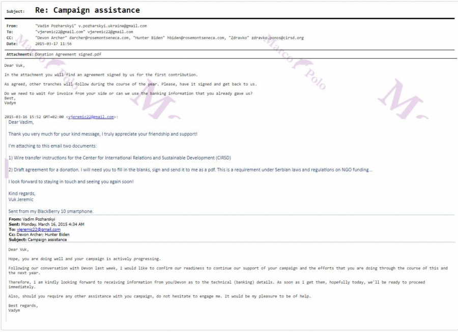 Komunikacija se odvijala preko ukrajinskog biznismena Vadima Požarskog, koji je služio kao savetnik kompanije "Burisma", pokazuju mejlovi čija autentičnost za sada nije nezavisno i zvanično potvrđena.