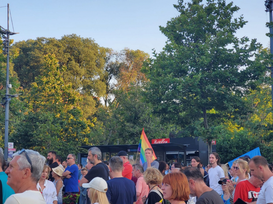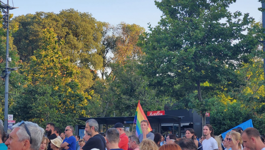 19:40 - Pojedini učesnici protesta nose zastave u duginim bojama u zastave Evropske unije.