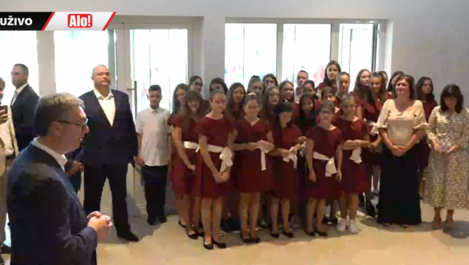 Predstavnici učenika škole dočekali su predsednika Vučića, a zatim je školski hor izveo pripremljeni repertoar pesma.
