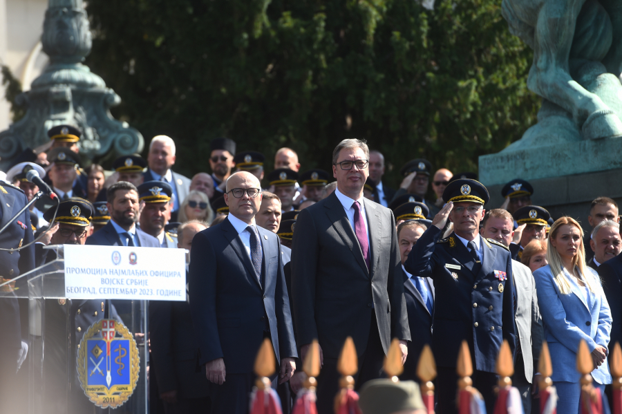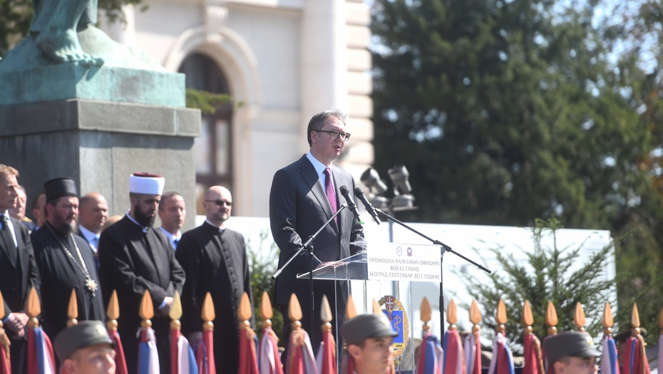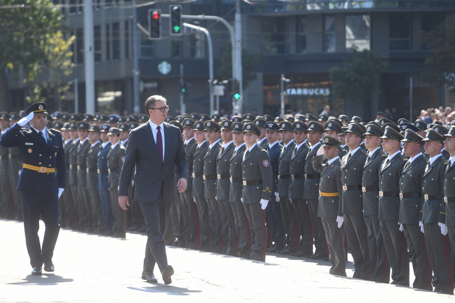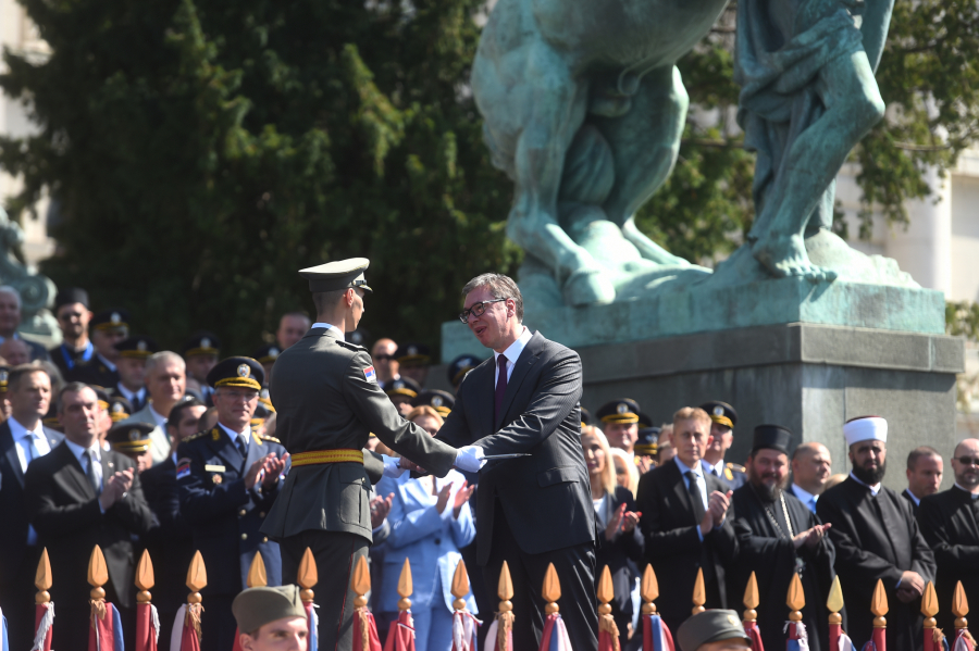 - Samo svojom odgovornošću i ozbiljnošću možemo svoj narod da sačuvamo. I ne smemo da pokažemo našu slabost. Nastavićemo da razvijamo svoju industriju, da damo sve od sebe da uvek budemo svoji na svome i da ne damo nikome Srbiju da napadne. Bićemo sve jači, a mi jače pojačanje od vas nismo mogli da dobijemo. Ne postoji oružje i oruđe koje vredi više od vaše pameti i od vaših srca. Hvala vam na trudu i energiji, hvala divni roditelji što ste podržali decu da služe otadžbini Srbiji, a mi ćemo gledati samo da vam budemo od pomoći. Neka živi Vojska Srbije, živela Srbija! - poručio je predsednik Srbije.