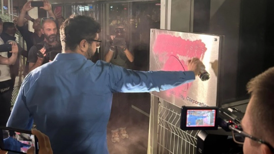 Tokom boravka demonstranata ispred zgrade RTS-a, on je sprejom išarao tablu koja stoji na ulazu u javni servis.