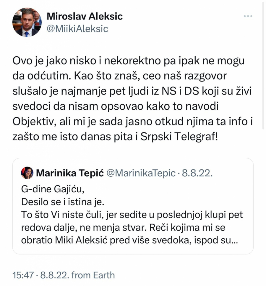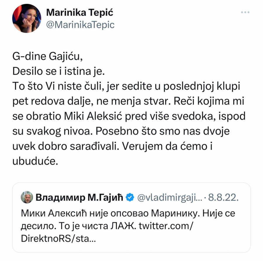 Aleksić opsovao Mariniku, ona kukala na tviteru, on joj javno odgovorio da laže