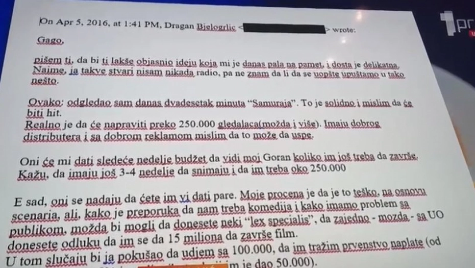 Antonijević je pokazao i mejlove koje mu je slao Dragan Bjelogrlić.