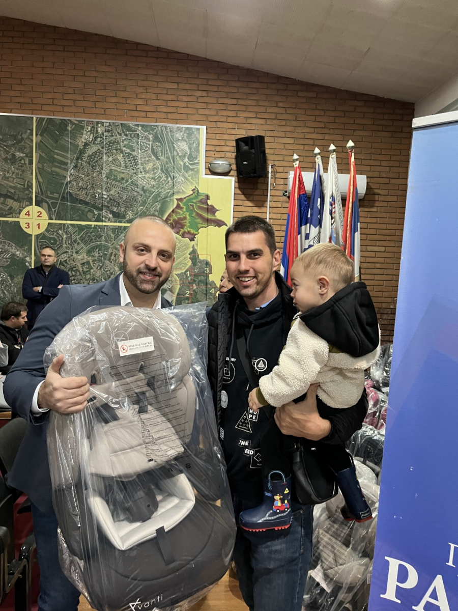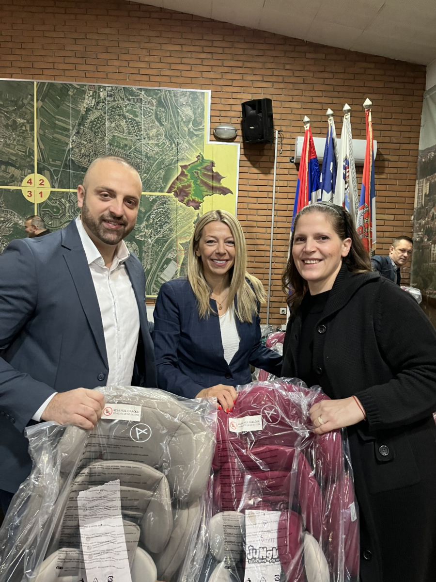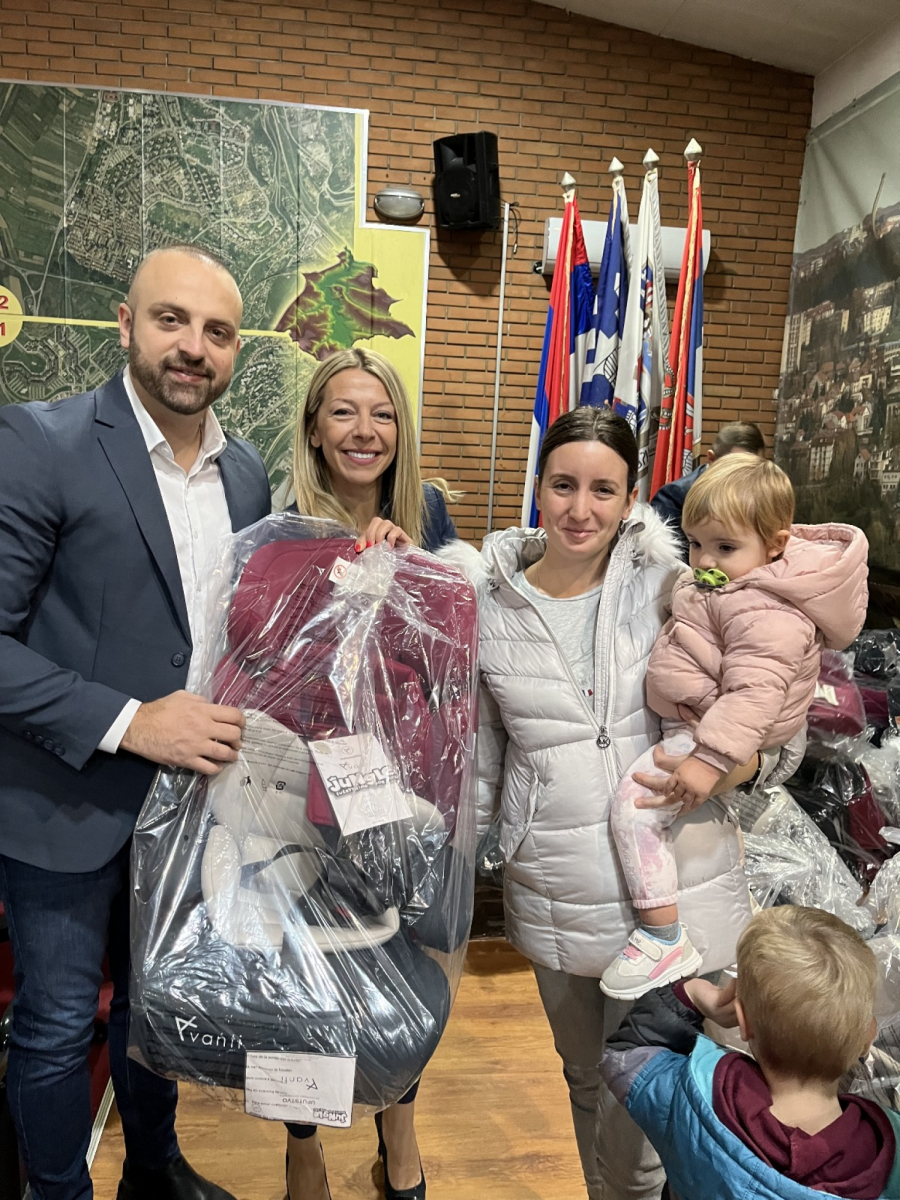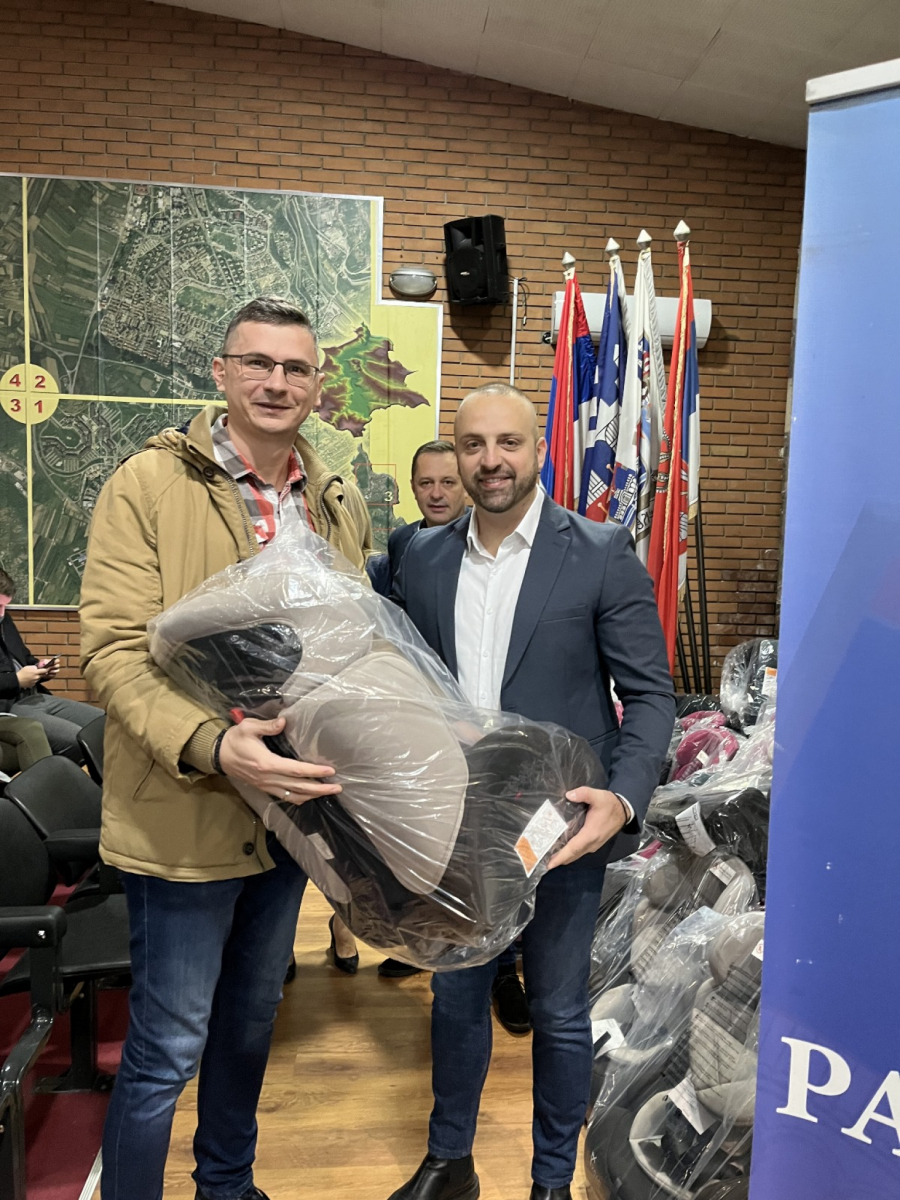 Nakon toga Simić je zajedno sa pomoćnicom direktora Agencije za bezbednost saobraćaja uručivao sedišta roditeljima.