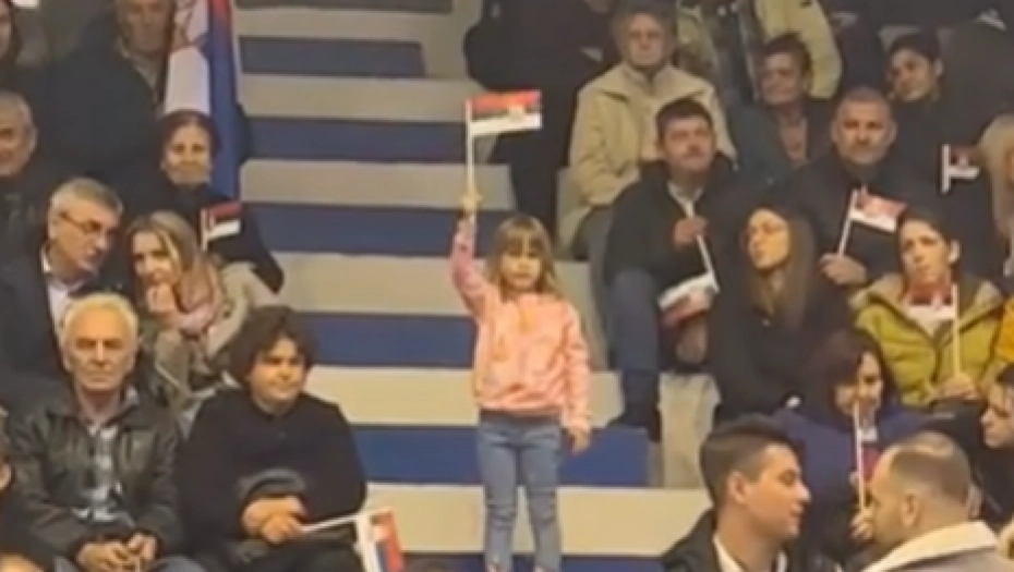 Devojčica od samo nekoliko godina osvojila je sva srca u sali kada je visoko podogla trobojku Srbije.