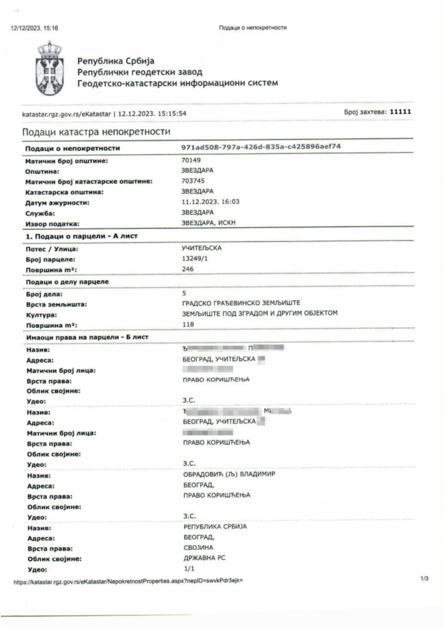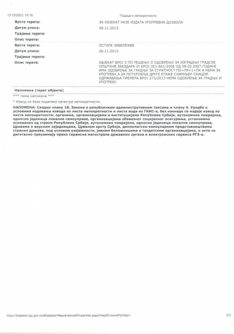 - Za objekat nije izdata upotrebna dozvola - doslovno stoji u podacima iz Katastra koje možete pogledati u galeriji fotografija iznad.