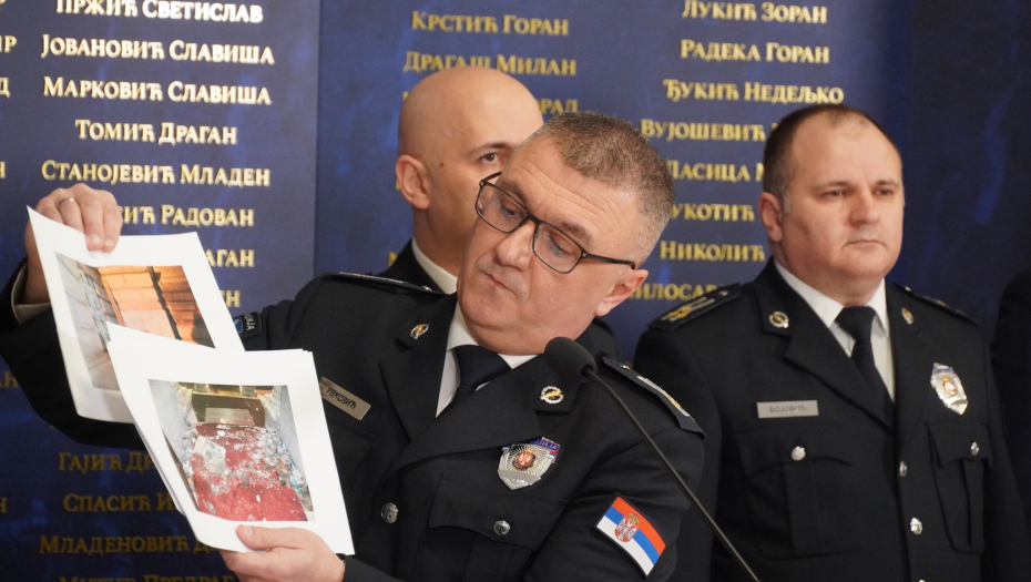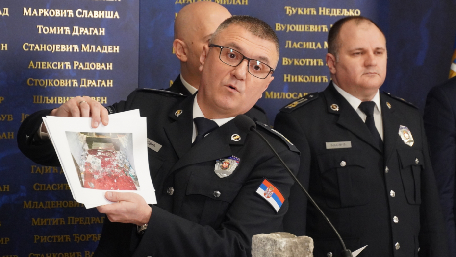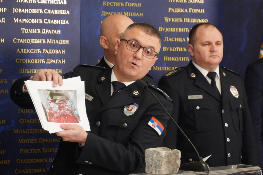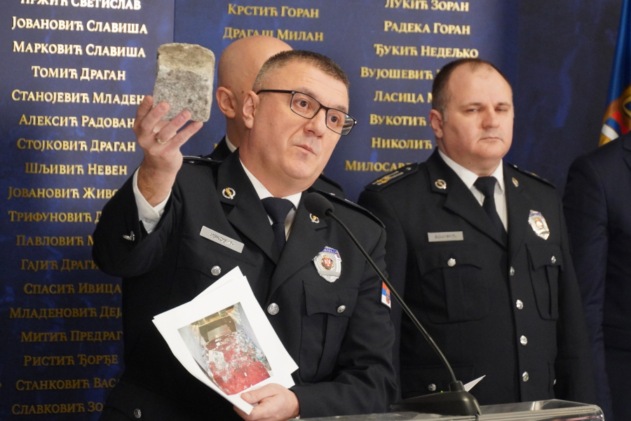 Načelnik Uprave policije Ivica Ivković je tokom obraćanja pokazao fotografije uništene Skupštine grada, kao i kamena, tačnije, kaldrme kojim su policijski službenici gađani.