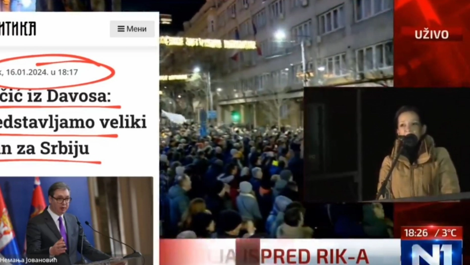 Međutim, predsednik Vučić se u to vreme obraćao javnosti iz Davosa, gde učestvuje na Svetskom ekonomskom forumu. Razdaljina od Beograda do Davosa je "tričavih" 1.115 kilometara, a Vučić je u 18.17 sati rekao: