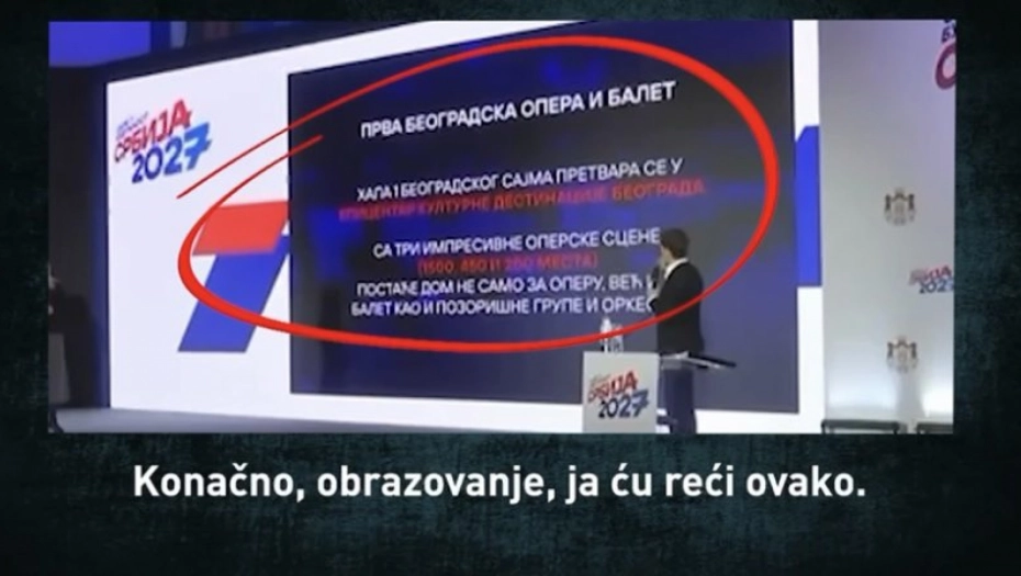 "U investicionom planu Skok u budućnost - Srbija Ekspo 2027, koji su predsednik Aleksandar Vučić i predstavnici Vlade obznanili ovih dana, među najavljenim projektima izostaju oni koji su pred decembarske izbore tako transparentno obećavali, pa će, kako činjenice pokazuju, Srbija skočiti u budućnost bez početka gradnje nove koncertne dvorane za ffilharmoniju, ai bez novog prostora za nacionalnu operu i balet," piše Danas u svom tekstu.